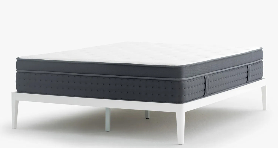The Noa Luxe Mattress is finished in a hand-tufted, poly-knit fabric. The sleeping surface is a pillowtop finish that uses clean white fabric. The side panels are dark grey.